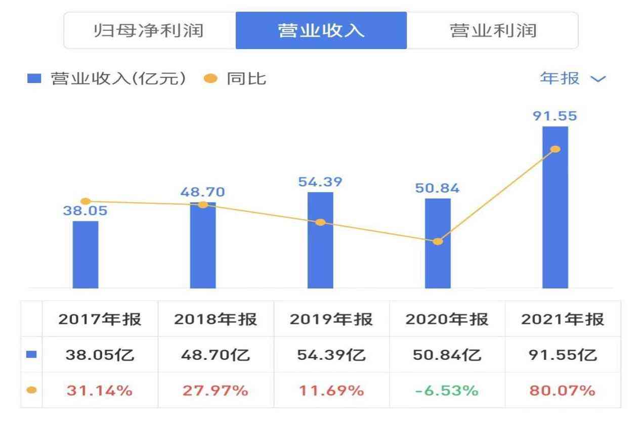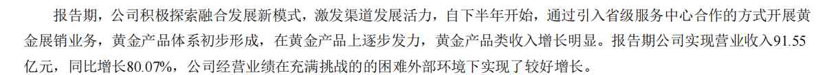 2021年度,公司实现营业收入91.55亿元,同比增长80.07%,主要由于黄金类产品销售增长所致,报告期公司营业利润15.79亿元,较上年同期增长20.61%,实现归属上市公司股东的净