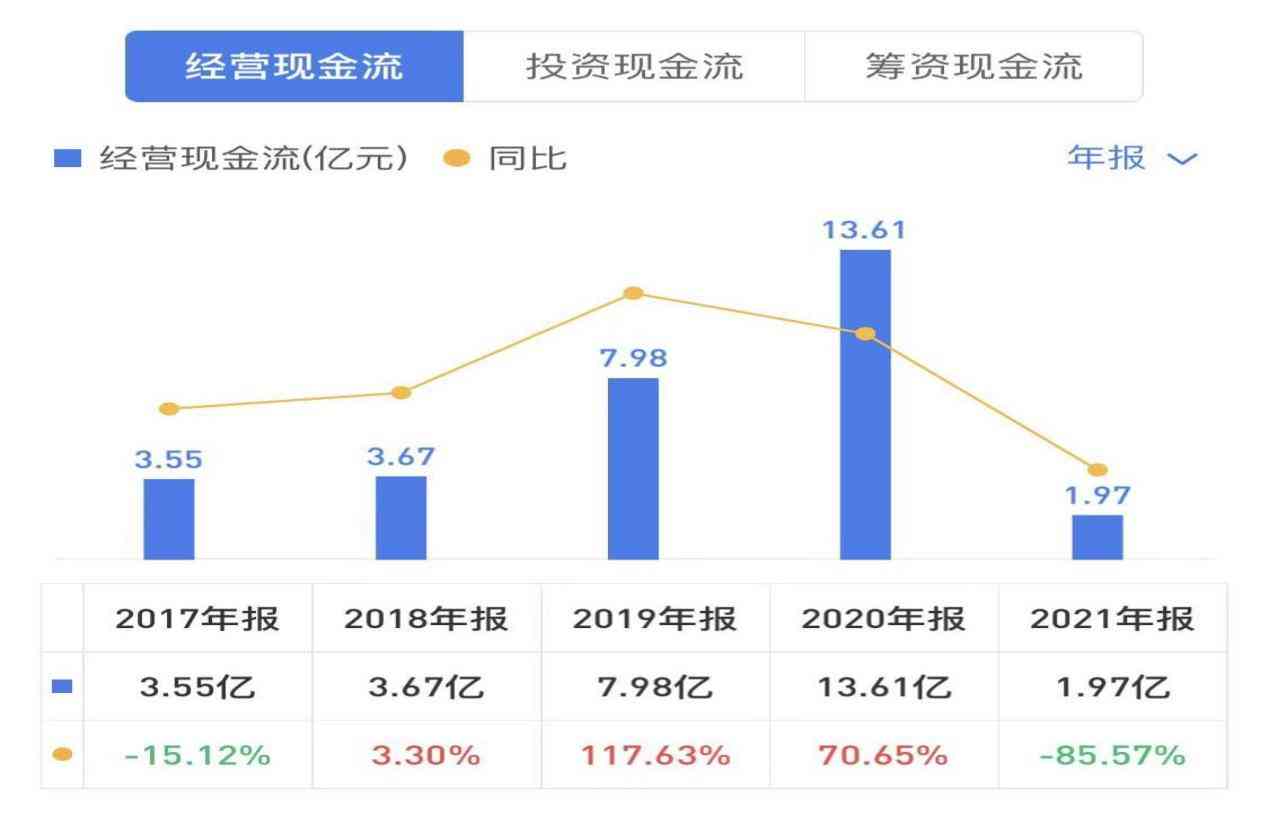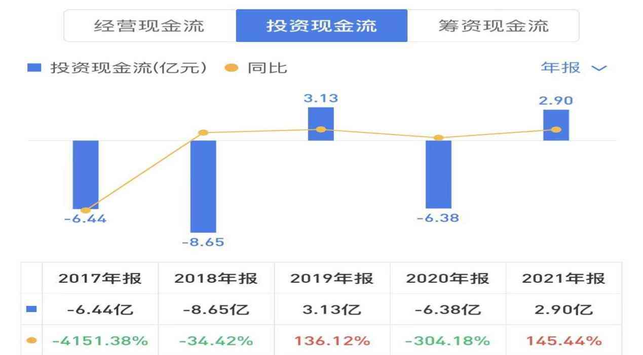 2021年经营性现金流直接拉垮,2017~2020年净利润累计为34亿,经营现金流累计为28.81亿。投资现金流累计2017~2020年为18.34亿