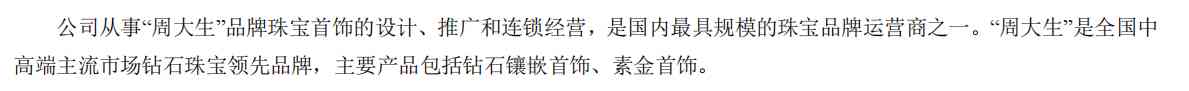 公司简介:公司从事“周大生”品牌珠宝首饰的设计、推广和连锁经营,是国内最具规模的珠宝品牌运营商之一。