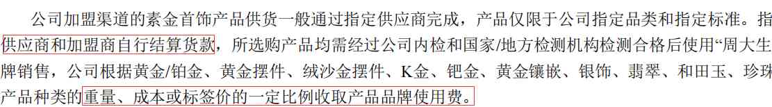 加盟商跟供应商自己去结算,周大生从中收点品牌使用费。