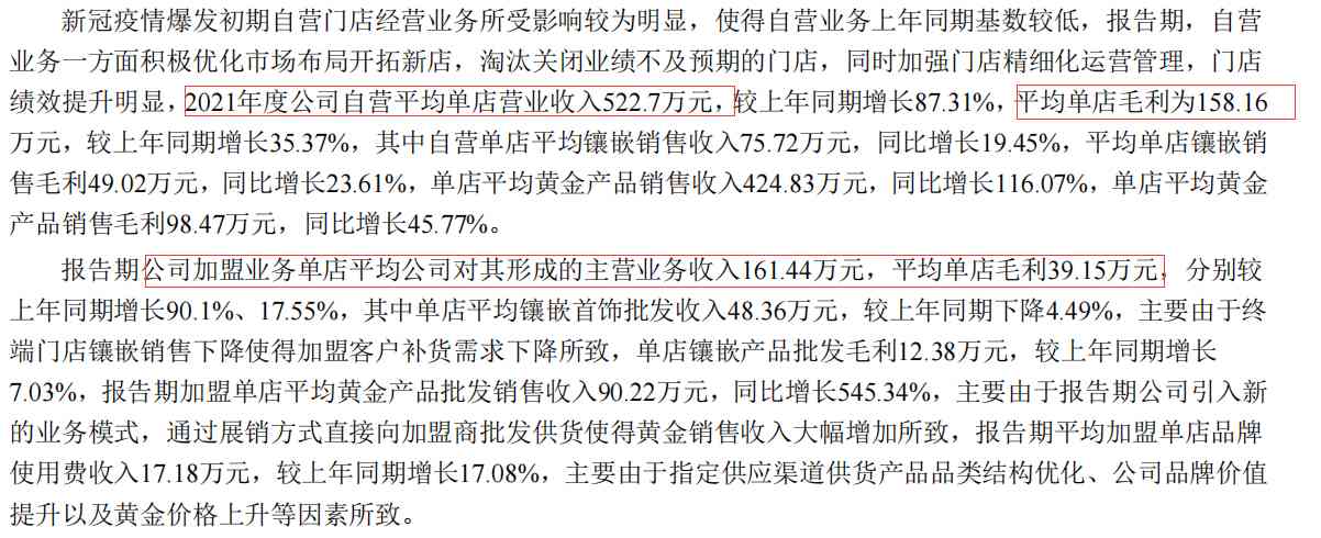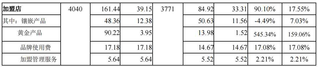 整个业务的大头是加盟店,加盟店的销量好坏直接影响企业的业绩。利空是现在结婚意愿越来越低,年轻人也不太觉得要买很多金器来充场面,利多是现在疫情慢慢地好转,各地防疫也比较从容,慢慢开始增加销量。但是可以看到,加盟店出去了品牌使用费和管理费之后,平均每家加盟店是不怎么赚钱的,大概就30来万,现在还赊账了这么多,这可能是个隐患。