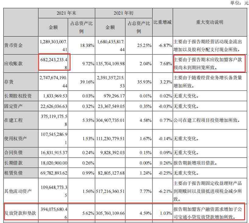 从总资产增量为3.61亿,我们可以大概拆分几个增量部分:①应收账款多5.47亿;②存货多了3.56亿;③放贷款多了0.9亿;④使用权多了1亿;在建多了0.7亿,减量部分大头在以下几个部分:①货币少了3.91亿;②其他流动资产(待认证及待抵扣进项税)少了4.08亿。