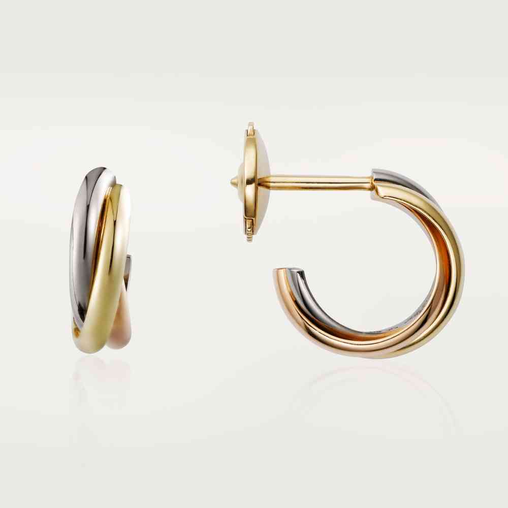 卡地亚经典的三色金系列,早在1924年由路易·卡地亚亲手打造,三枚圆环紧紧相扣。这个系列自诞生之初就以其别致的风格而备受瞩目。三枚不同颜色的18K金环寓意着爱情、友情、忠诚。这款耳环线条流畅大气的同时,还有着圆润的曲线感,搭配职业装或者小礼服都非常有气质。