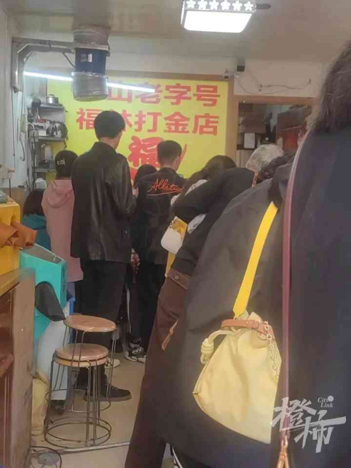 排在第二位的是一对小夫妻,早上8点半就来了,两人结婚十几年了,这次带来了家里不用的黄金戒指、项链、配饰,小哥从城西过来开车40分钟过来,想给老婆打个镯子:“这家店是我老婆在小红书上看到的,我们就过来了,知道火,但是没想到这么火,以为来的已经很早了,还是排在了第二位。”