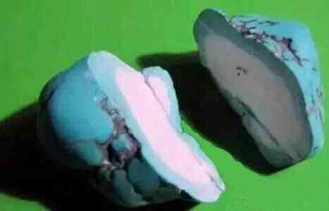 (2)再造绿松石:又称“压制绿松石”,是用绿松石微粒和蓝色粉末状的材料在一定的压力和温度下压结而成的,其中含有微量的绿松石,一般的辨别方法很难分辨,但是还是可以通过这些方法来辨别: