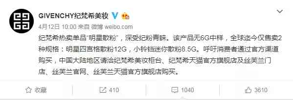 纪梵希官微表示明星散粉无6g中小样