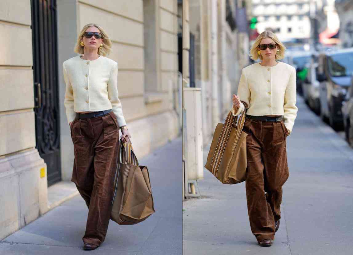 衣柜里容易穿出财阀千金的小香风外套很适合与复古耳夹相配,用复古感去化解它的贵气显得更会穿。elsa hosk这套白色小香风搭配棕色灯芯绒阔腿裤,再配上一副金色复古大耳夹的look就很复古,鞋包的搭配也轻松,去掉了小香风外套的“用力感”。像有品位的时髦小姐姐出门买杯咖啡看展~