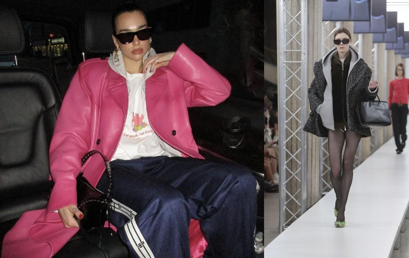 如果觉得太运动休闲的穿搭中加入复古大耳饰太突兀,反差太大,可以像啪姐和miumiu23秋冬T台一样,休闲连帽卫衣外穿一件廓形的大衣或者皮衣,用廓形外套与耳饰风格上暗暗呼应`,整体就和谐许多了,是“你(休闲)中有)我(精致复古),我中有你”的“夹心”式搭配
