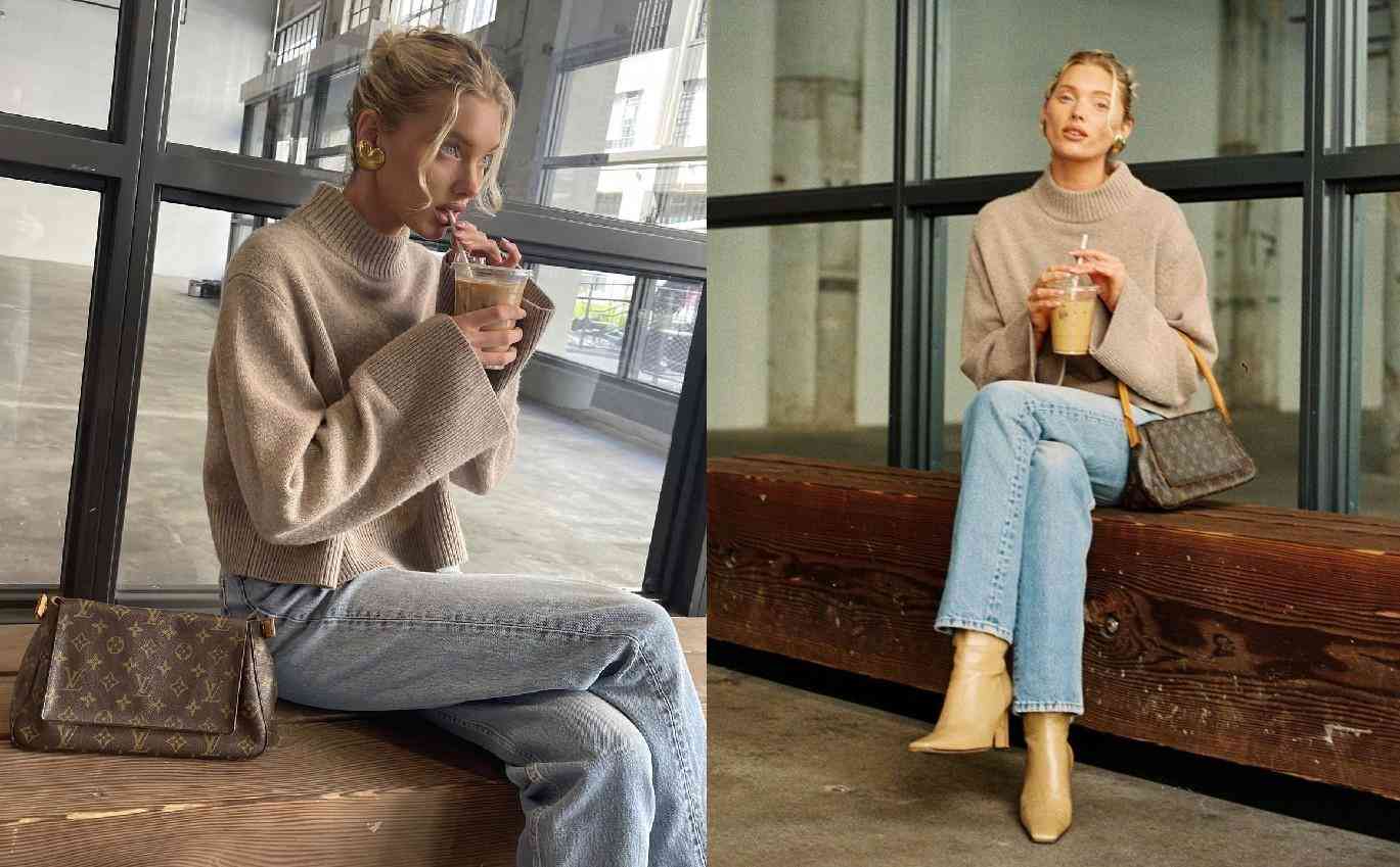 elsa hosk这套也蛮日常的,思路同样可以参考,毛衣牛仔裤春日必备,用高跟鞋呼应耳饰的女人味,用中古包呼应耳饰的复古感~整体性同样也很高~