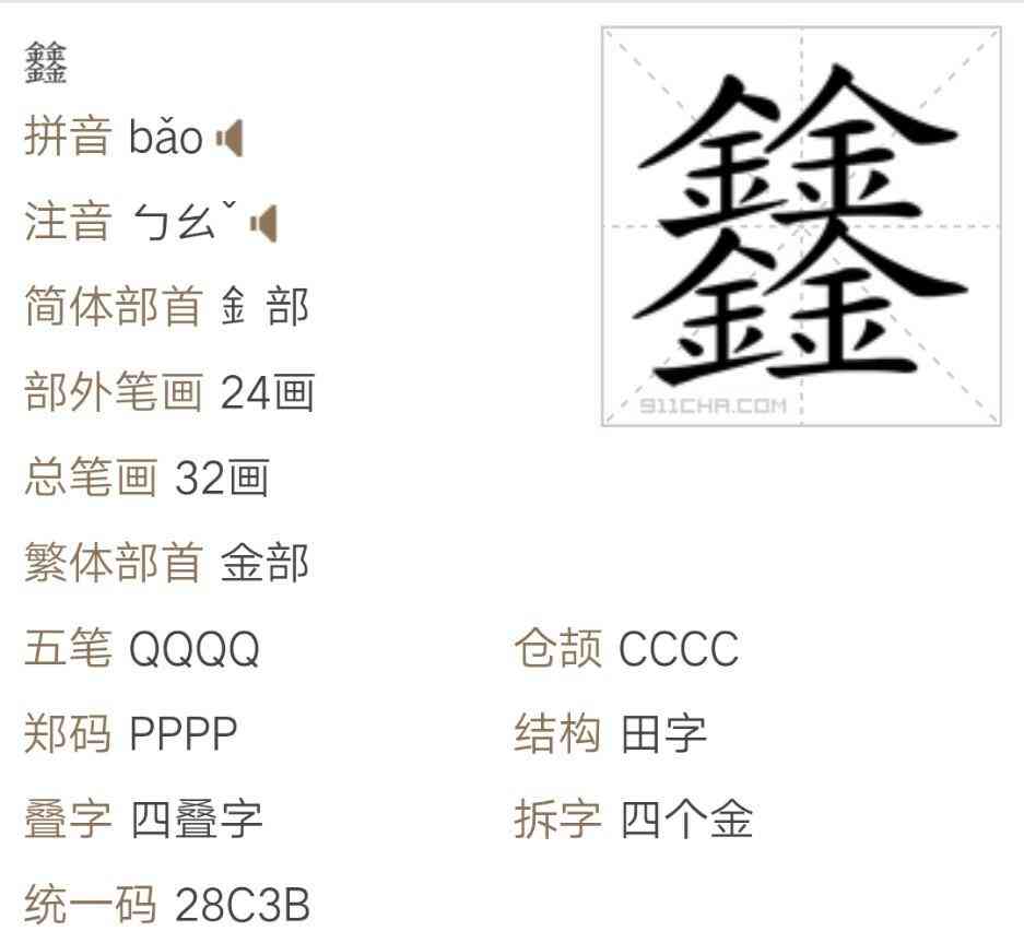 金、鍂、鑫、。两个金的“鍂”字,读音:piān,意思是古代的一种乐器。古称铜钹、铜盘,民间称镲,是一种打击碰奏体鸣的乐器。在陕西、四川、甘肃等地的方言中叫作pian,cha(鍂镲)。3个金的“鑫”字,读作xīn,多用于商店字号、人名用字等,取其金多,财运兴旺发达之意。4个金的“”字,读音为:bǎo,是“宝”的异体字,含义与宝相同。