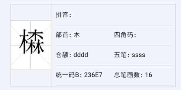另外,还有6个木的叠字,读作yàn,《五音篇海》:音厭,又音其。甚至还有8个木的叠字的存在,即由4个“林”字的叠字结构形成,读音为shā,《五音篇海》:音殺。出自《西江賦》。