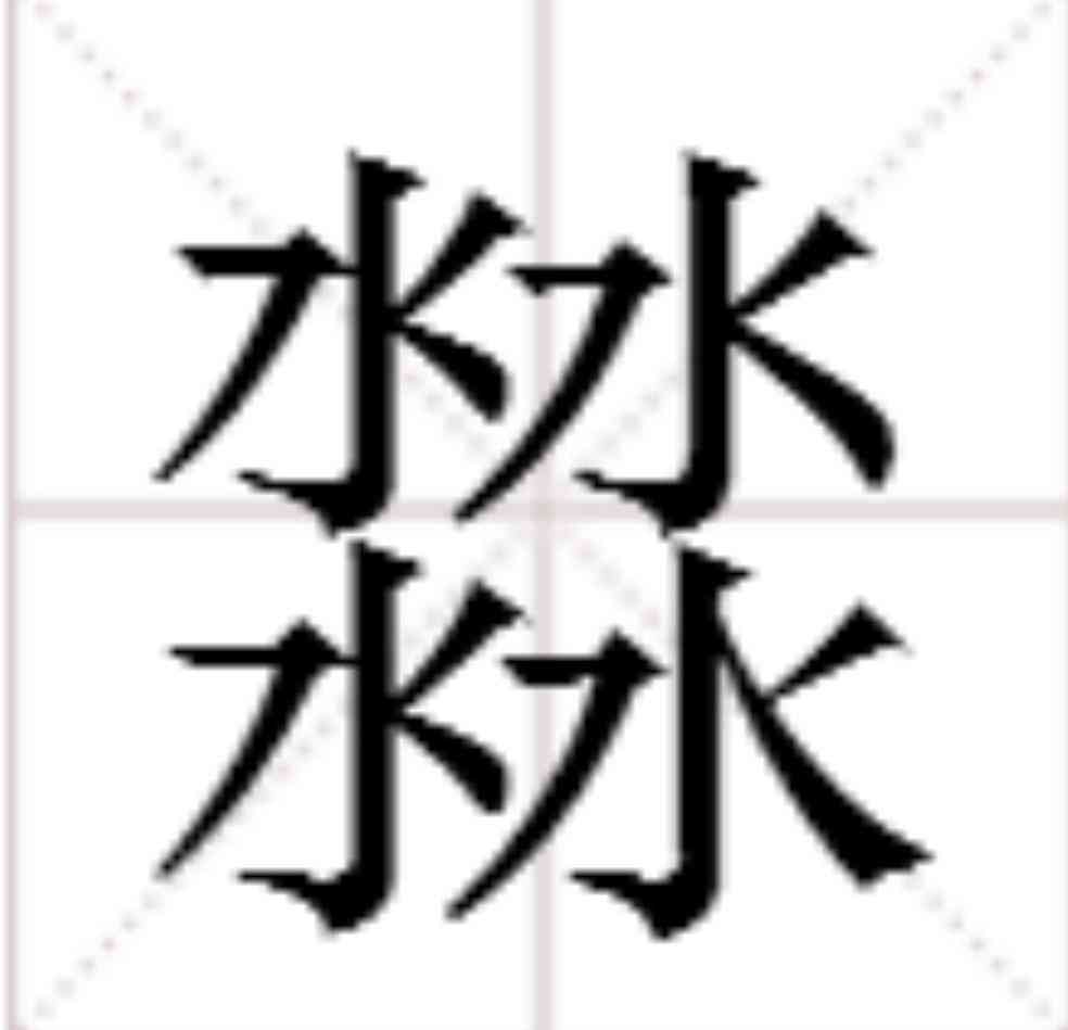 水、沝、淼、㵘。两个水的“沝”字,读音zhuǐ。基本含义是滩碛聚集的地方。3个水的“淼”学,读作miǎo,会意字,从三水。又作“渺”。本义是形容水大的样子。《楚辞·九章·哀郢》等均有相关记载。多用作人名或姓。4个水的“㵘”字,拼音:màn。意思是很浩大的水。