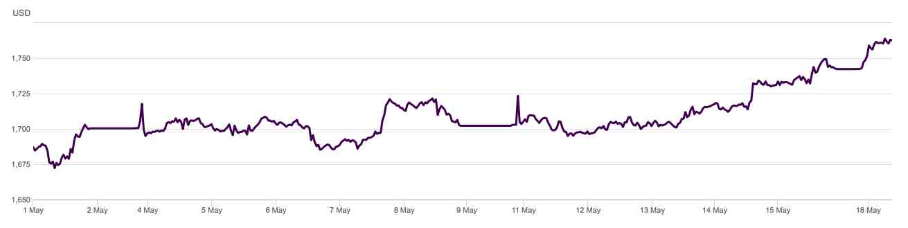 5月一开月,现货黄金价格就跳涨至每盎司1700美元,后持续维持在每盎司1700美元以上的高位。5月13日以来,上海黄金交易所金价已连续4个交易日保持上涨,今日单日涨幅更扩大至近3%。