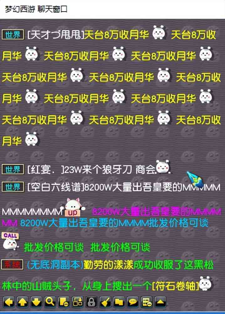 就在昨天维护更新之后,有一位玩家发现区里商人的异常,本来维护之前还有散人9000多万收吾皇礼包,结果下午商人就8200W批量抛售。按照商人的语气,如果大量买的话,价格还能更低点。