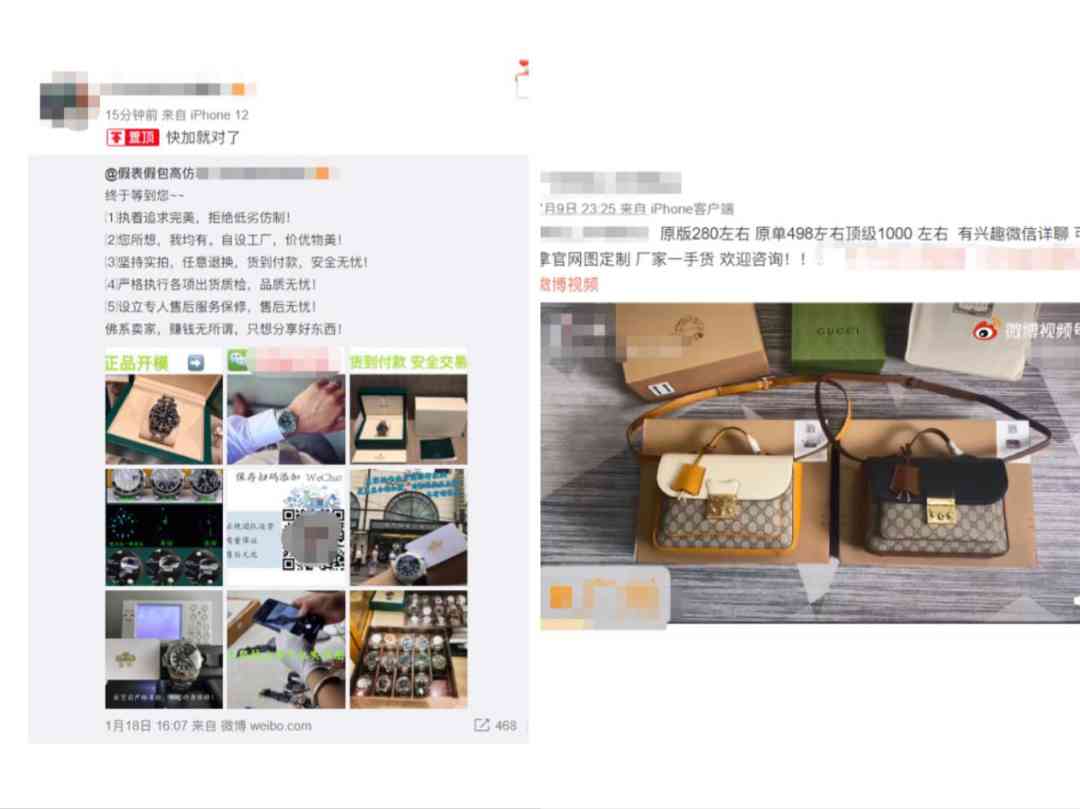 锌刻度看到,在微博上不乏售卖假冒名牌商品的广告信息,将“正品开模”“厂家定制”等话语写在博文与相关奢侈品图片上,还以“加V”、“V号”等暗语留下联系方式坐等客户上门,着实玩得一手好神秘。