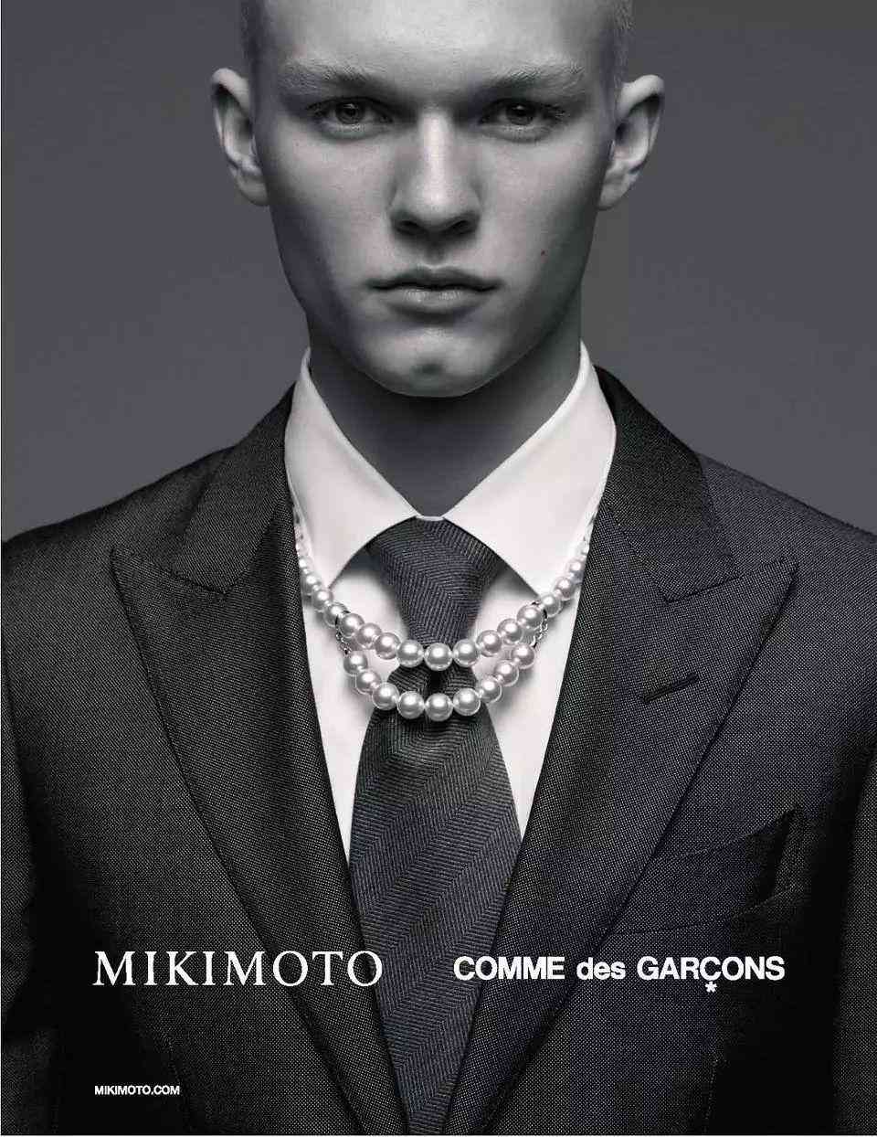 这个特别的系列别出心裁地选择了男性模特展示珠宝,在黑白系的西服上呈现中性风格的珍珠短项链。