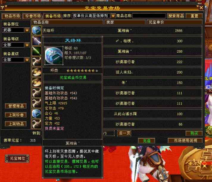 紫禁之巅服务器卡88的玩家也是非常多,但是极品武器几乎没有,寄售只有一个八星单玄的60级八星环,售价也是相当便宜只有2666元宝。