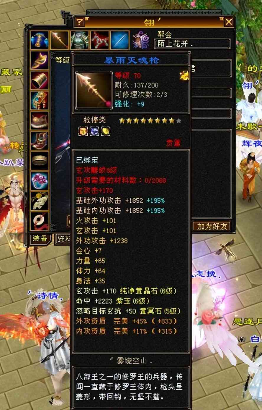 这位卡79级老铁带的是火玄双属性深蓝八星暴雨灭魂枪,带会心、力量、体力和身法。