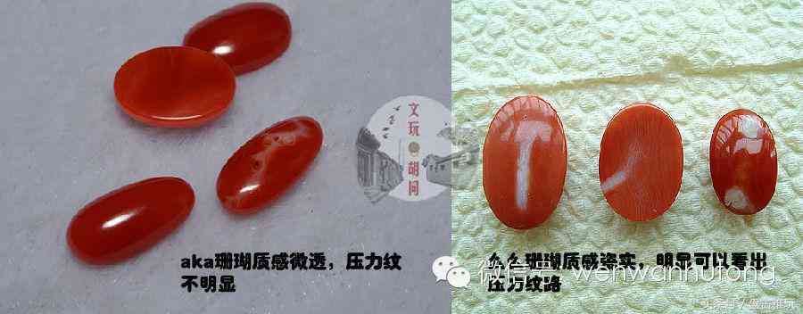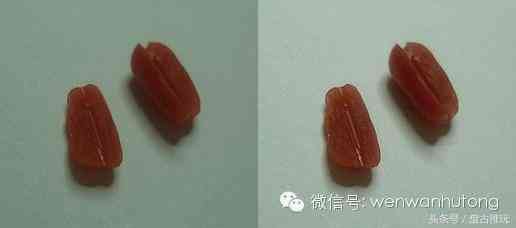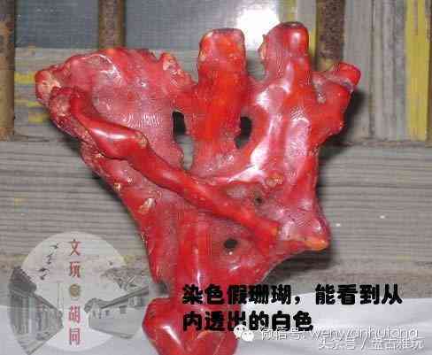 3.仔细观察染色珊瑚的红色多浮于表面,能看出从内部透出来的白色,但跟白芯是完全不同的。假珊瑚也会仿制出白心,但天然珊瑚(阿卡、么么)的白芯,白色和红色多数界限清晰,而染色珊瑚的白芯,多数白色和红色界限不清晰,有颜色过渡。