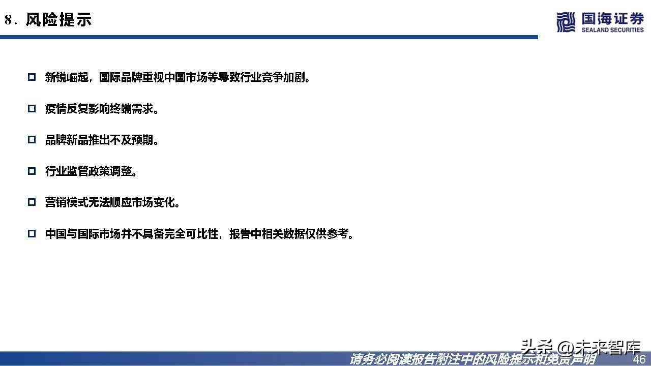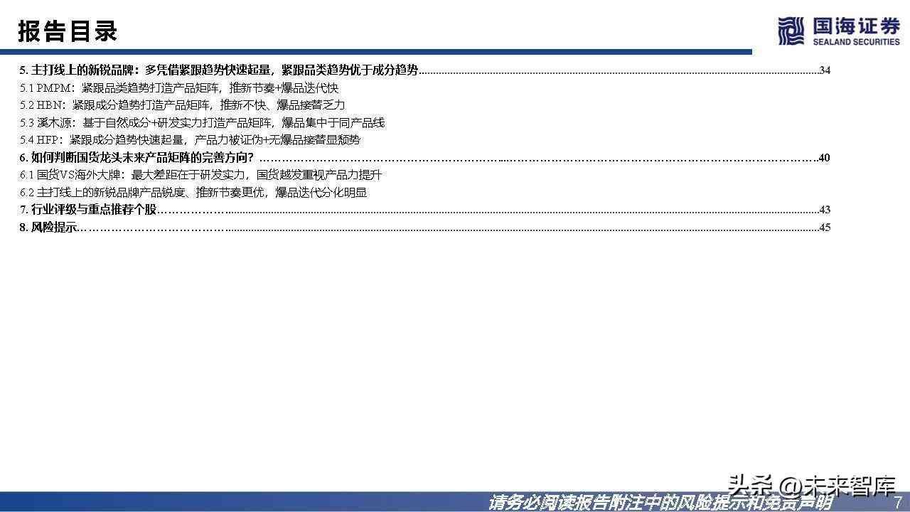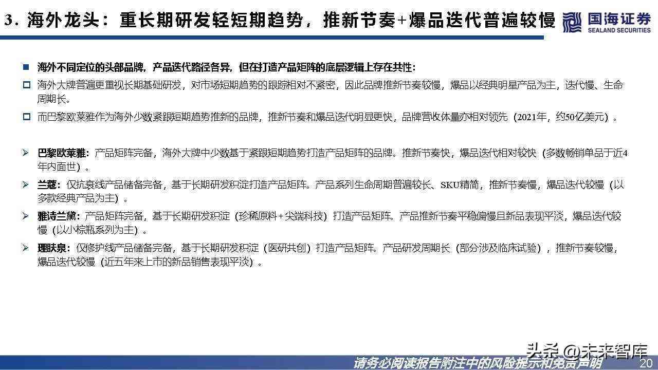 国货VS海外大牌:最大差距在于研发实力,国货在趋势跟踪的紧密度及反应速度上普遍优于海外大牌。海外大牌优于国货之处:基础研发积累时间更长,形成专利成分/技术壁垒;产品价格带普遍更宽(强研发带来议价权,高端线拓展更顺 畅)、生命周期更长。国货优于海外大牌之处:因其国内电商渗透率远高于海外,国货对于趋势跟踪的紧密度、反应速度普遍优于海外大牌,体现在:推新节奏 更快、爆品迭代更快。