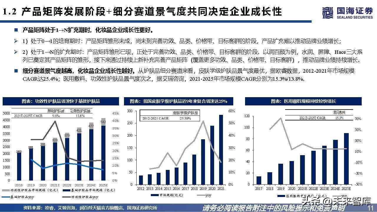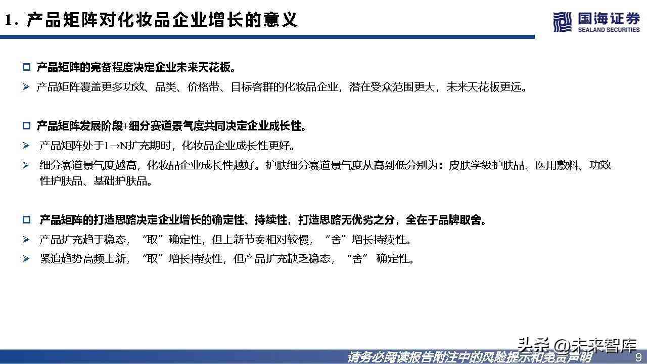 产品矩阵对化妆品企业增长的意义,体现在影响其未来天花板、成长性、增长的确定性与持续性上。1)产品矩阵越完备,企业未来天花 板更远;2)产品矩阵处于1→N扩充期/细分赛道景气度越高时,企业成长性更好。3)产品矩阵的打造思路决定企业增长的确定性、持续 性,打造思路无优劣之分,全在于品牌取舍:①产品扩充趋于稳态,“取”确定性,但上新节奏相对较慢,“舍”增长持续性;②紧追趋 势高频上新,“取”增长持续性,但产品扩充缺乏稳态,“舍” 确定性。