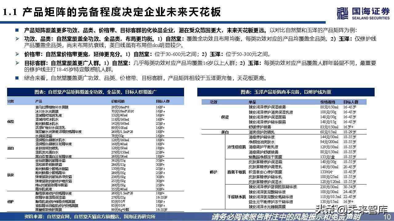 产品矩阵覆盖更多功效、品类、价格带、目标客群的化妆品企业,潜在受众范围更大,未来天花板更远。以对比自然堂和玉泽的产品矩阵为例:功效、品类:自然堂覆盖全功效、全品类,布局更均衡。1)自然堂:覆盖全功效且布局均衡,每类功效对应的产品均覆盖全品类。2)玉泽:仅修护线 产品覆盖全品类,尚未布局抗衰线,美白线虽有布局但sku明显较少。价格带:自然堂价格带更宽,延伸更充分。1)自然堂:位于30-600元之间;2)玉泽:位于50-300元之间。目标客群:自然堂覆盖更广人群。1)自然堂:几乎每类功效对应产品均覆盖16岁以上人群;2)玉泽:每类功效对应产品覆盖人群年龄层不同,最重要 的修护线主打18-45岁特定敏感肌人群。