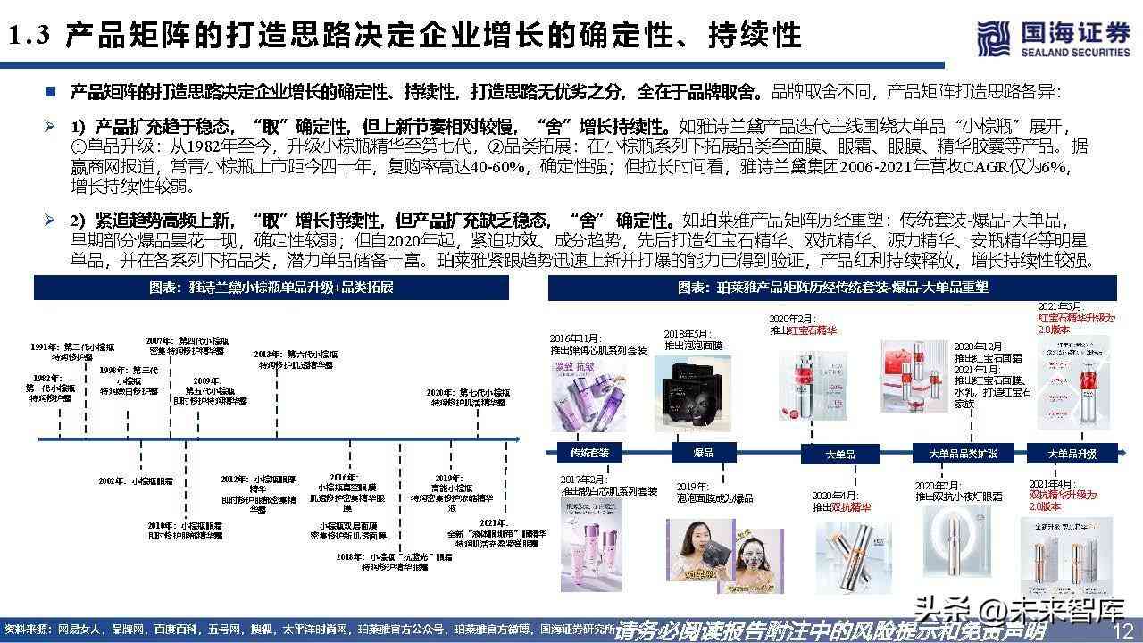 产品矩阵的打造思路决定企业增长的确定性、持续性,打造思路无优劣之分,全在于品牌取舍。品牌取舍不同,产品矩阵打造思路各异:1)产品扩充趋于稳态,“取”确定性,但上新节奏相对较慢,“舍”增长持续性。如雅诗兰黛产品迭代主线围绕大单品“小棕瓶”展开, ①单品升级:从1982年至今,升级小棕瓶精华至第七代,②品类拓展:在小棕瓶系列下拓展品类至面膜、眼霜、眼膜、精华胶囊等产品。据 赢商网报道,常青小棕瓶上市距今四十年,复购率高达40-60%,确定性强;但拉长时间看,雅诗兰黛集团2006-2021年营收CAGR仅为6%, 增长持续性较弱。