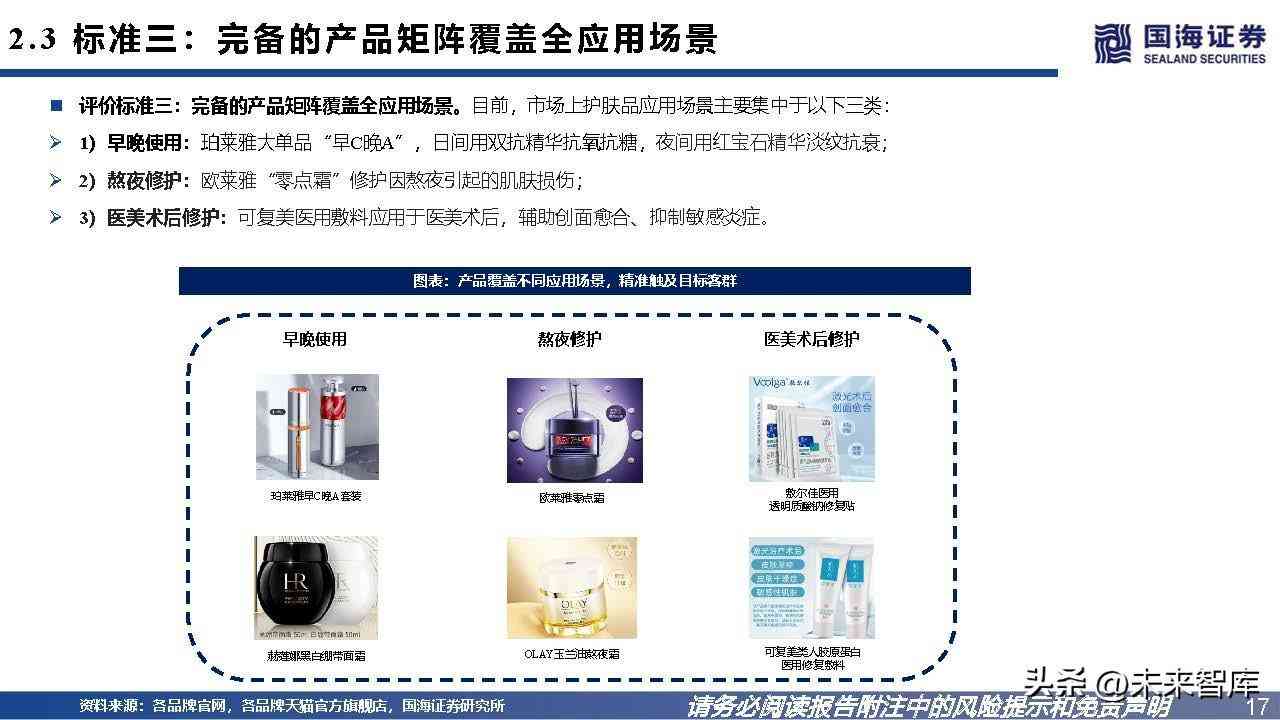 评价标准三:完备的产品矩阵覆盖全应用场景。目前,市场上护肤品应用场景主要集中于以下三类: 1)早晚使用:珀莱雅大单品“早C晚A”,日间用双抗精华抗氧抗糖,夜间用红宝石精华淡纹抗衰;2)熬夜修护:欧莱雅“零点霜”修护因熬夜引起的肌肤损伤;3)医美术后修护:可复美医用敷料应用于医美术后,辅助创面愈合、抑制敏感炎症。