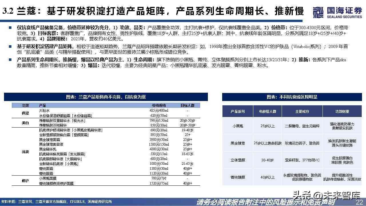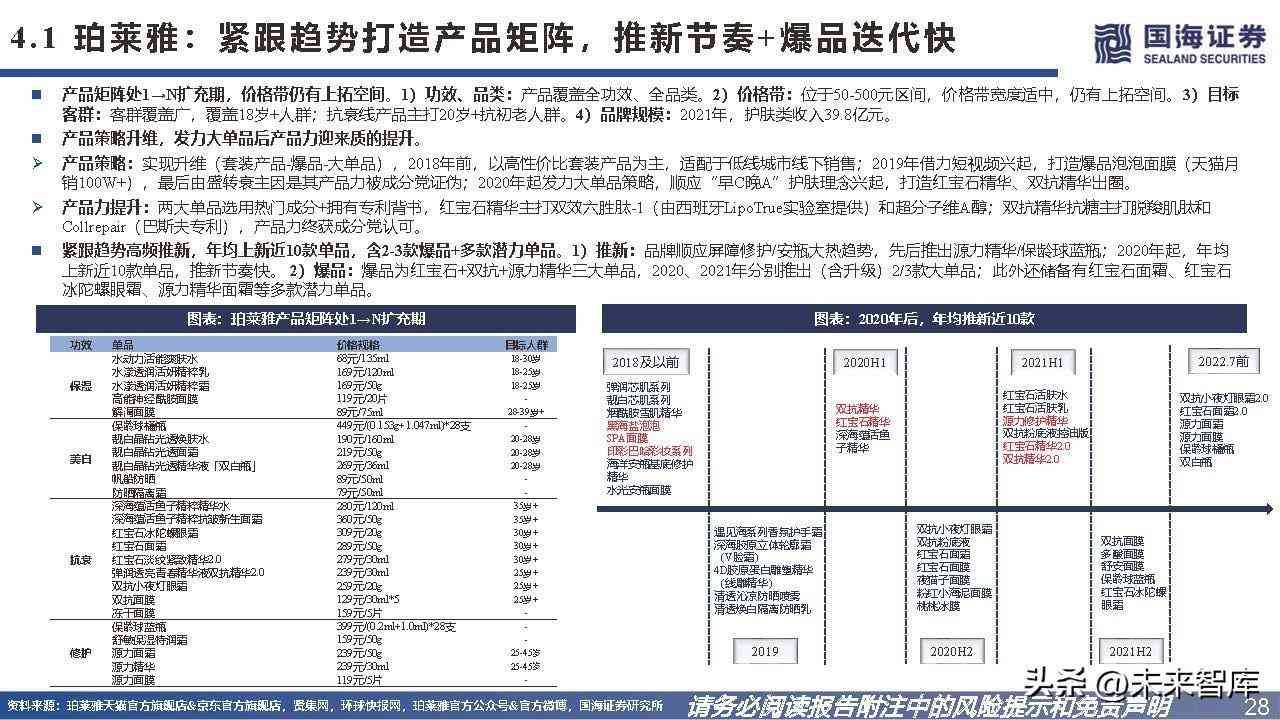 产品矩阵处1→N扩充期,价格带上拓空间较大。1)功效、品类:产品覆盖全功效,保湿、抗衰、修护线覆盖全品类。2)价格带:位于50-650元区间,价格带宽度适中, 仍有上拓空间。3)目标客群:客群覆盖广,覆盖18岁+人群(几乎适用于所有年龄层)。4)品牌规模:2021年,营收达12.3亿元。科技壁垒+紧跟趋势,围绕HA+X打造产品矩阵。