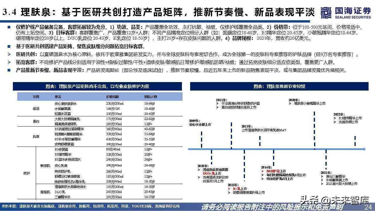 仅修护线产品储备完备,客群拓展较为充分。1)功效、品类:产品覆盖全功效,主打抗敏、祛痘,仅修护线覆盖全品类。2)价格带:位于100-500元区间,价格带适中, 仍有上拓空间。3)目标客群:客群覆盖广,产品覆盖12岁+人群;不同产品精准定位细分人群,主打20岁+存在皮肤问题的人群。4)品牌规模: 2021年,营收约20亿美元。 基于医研共创搭建产品矩阵,聚焦皮肤细分问题拓宽目标客群。