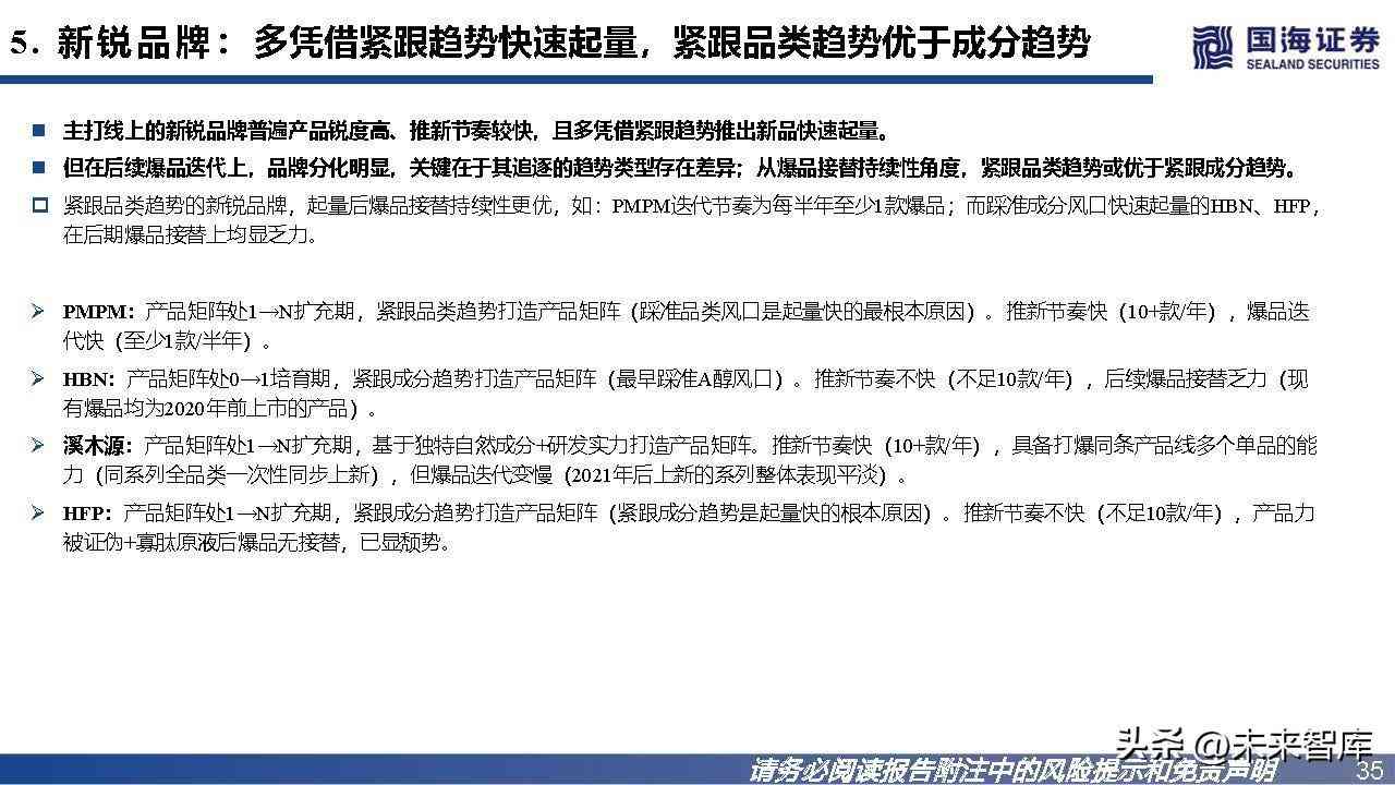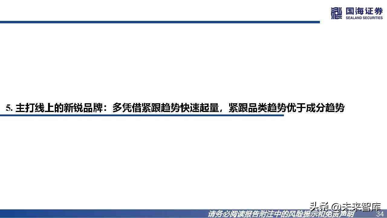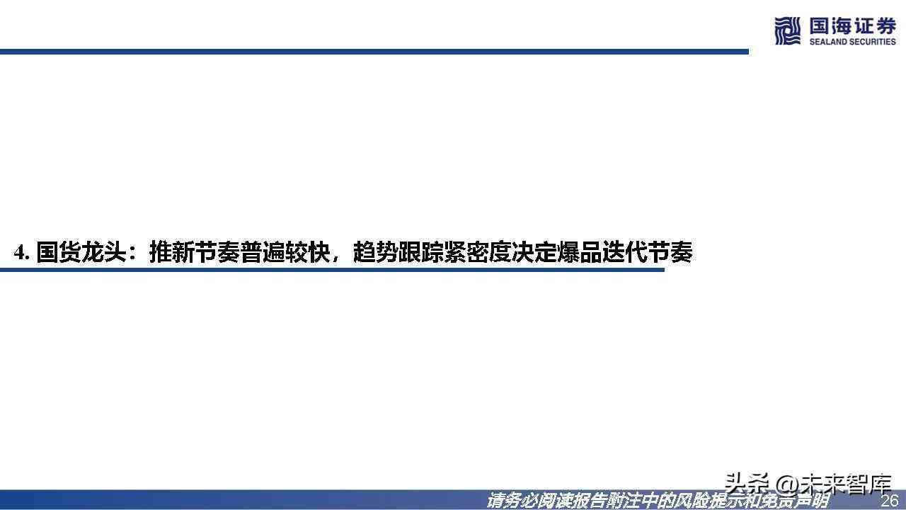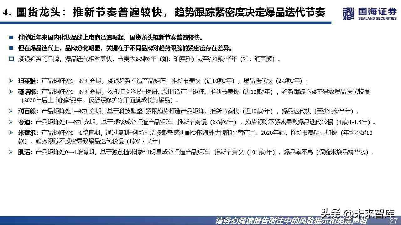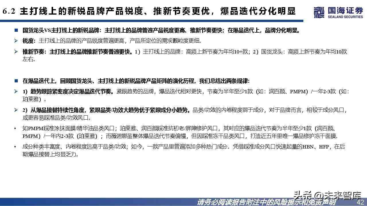 国货龙头VS主打线上的新锐品牌:主打线上的品牌普遍产品锐度更高、推新节奏更快;在爆品迭代上,品牌分化明显。锐度:主打线上的品牌的产品锐度普遍更高,产品所定位的需求颗粒度更细。推新节奏:主打线上的品牌推新节奏普遍更快。1)主打线上的品牌:高频上新节奏为年均10+款;2)国货龙头:高频上新节奏为年均10款 左右。