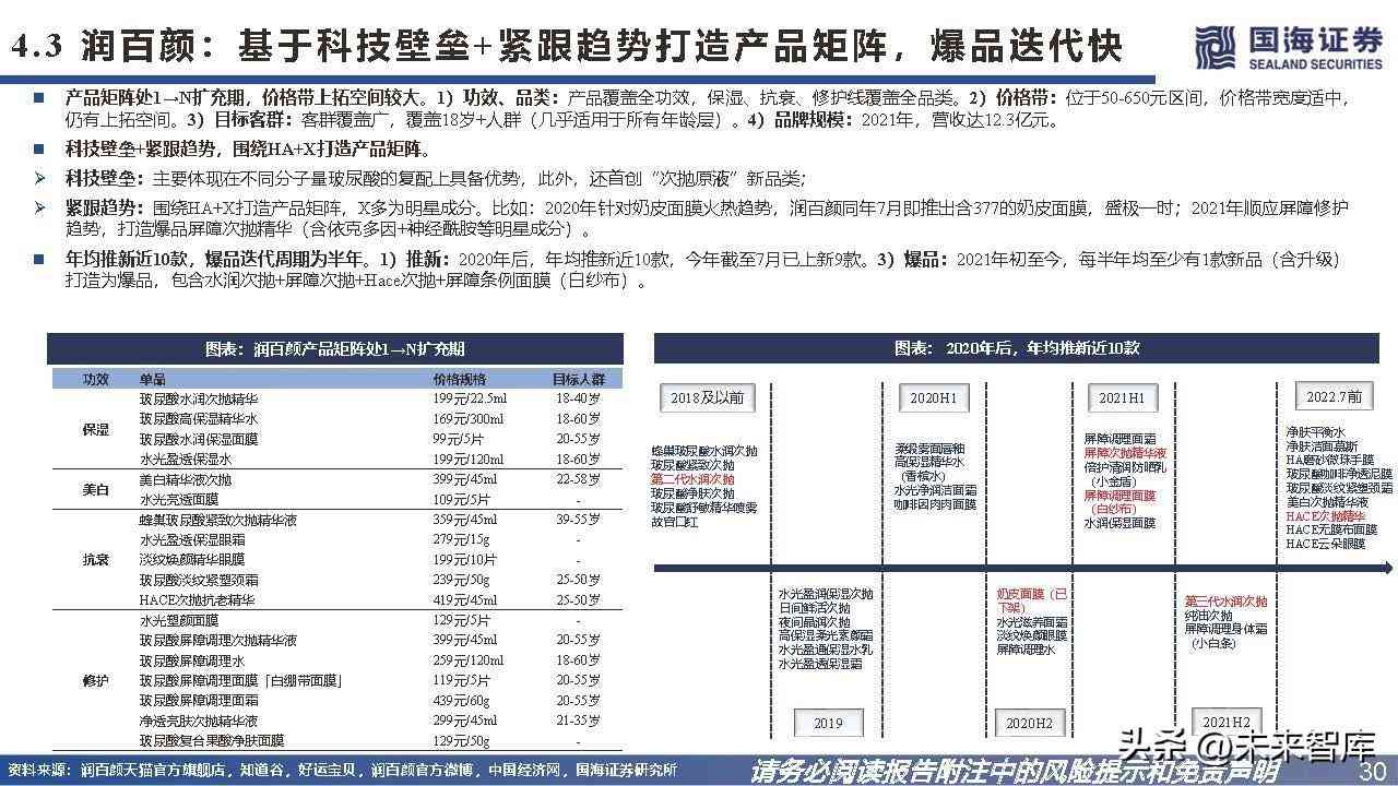 4.3、润百颜:基于科技壁垒+紧跟趋势打造产品矩阵,爆品迭代快