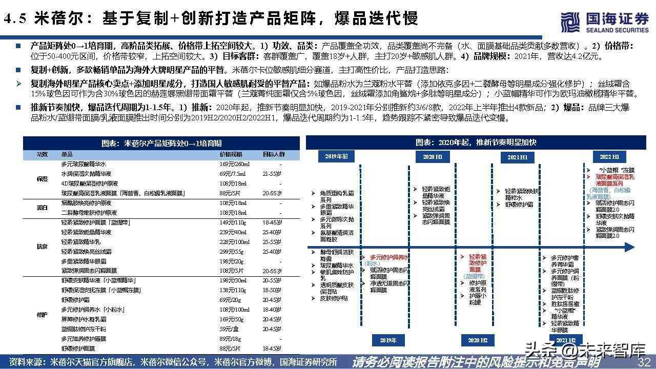 产品矩阵处1→N扩充期,价格带上拓空间较大。1)功效、品类:产品覆盖全功效,保湿、抗衰、修护覆盖全品类。2)价格带:位于50-400元区间,价格带较窄,上拓 空间较大。3)目标客群:客群覆盖广,覆盖16岁+人群( 几乎适用于所有年龄层) 。4)品牌规模:2019年10月成立,2021年GMV破10亿元。踩准品类风口是起量快的最根本原因。