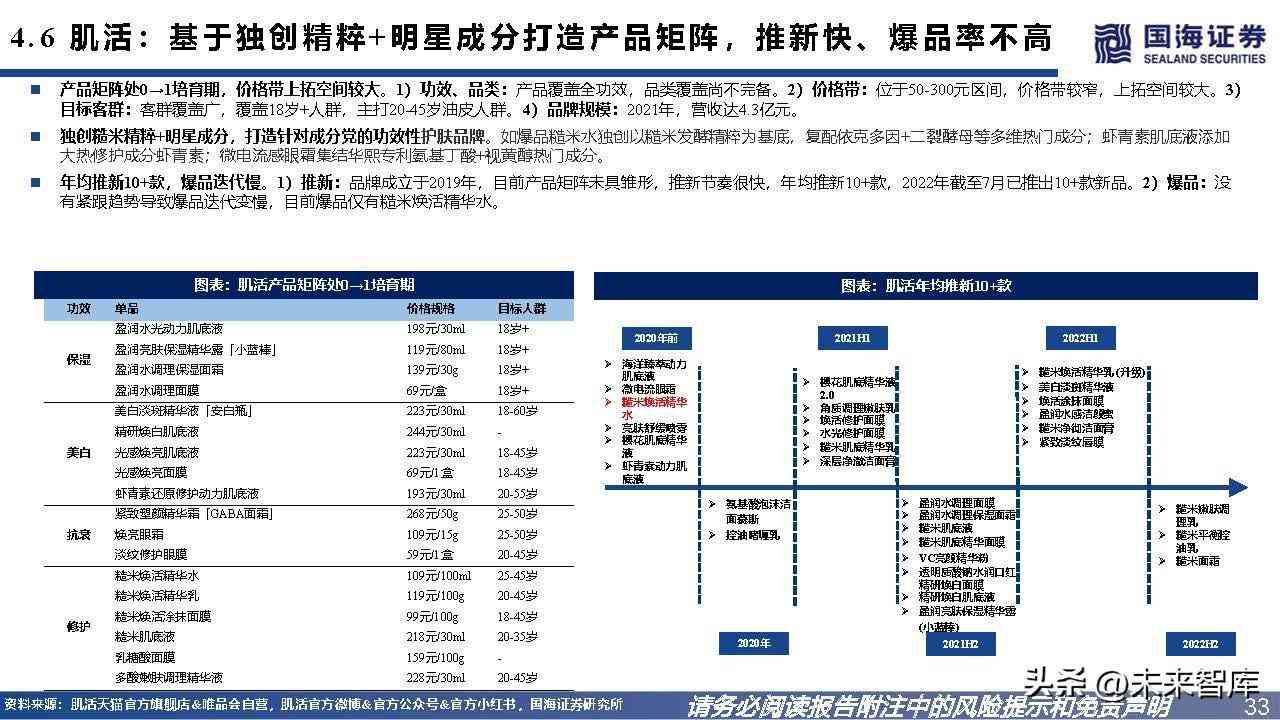 4.6、肌活:基于独创精粹+明星成分打造产品矩阵,推新快、爆品率不高