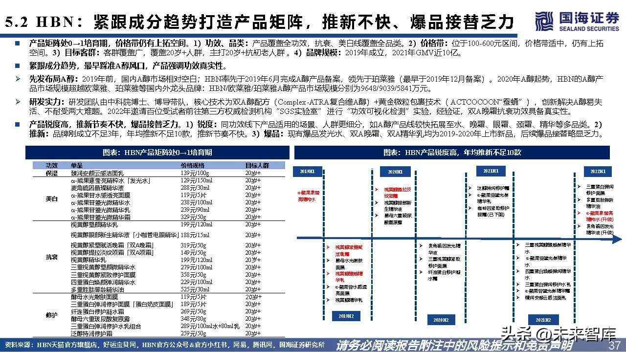 5.2、HBN:紧跟成分趋势打造产品矩阵,推新不快、爆品接替乏力