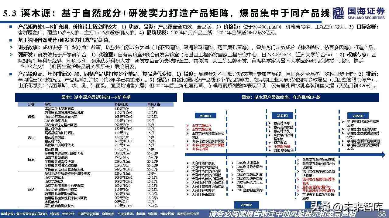 产品矩阵处1→N扩充期,价格带上拓空间较大。1)功效、品类:产品覆盖全功效、全品类。2)价格带:位于50-400元区间,价格带较窄,上拓空间较大。3)目标客群: 客群覆盖广,覆盖15岁+人群,主打15-25岁敏感肌人群。4)品牌规模:2020年1月产品上线,2021年全渠道GMV破8亿元。 基于独特自然成分+研发实力打造产品矩阵。