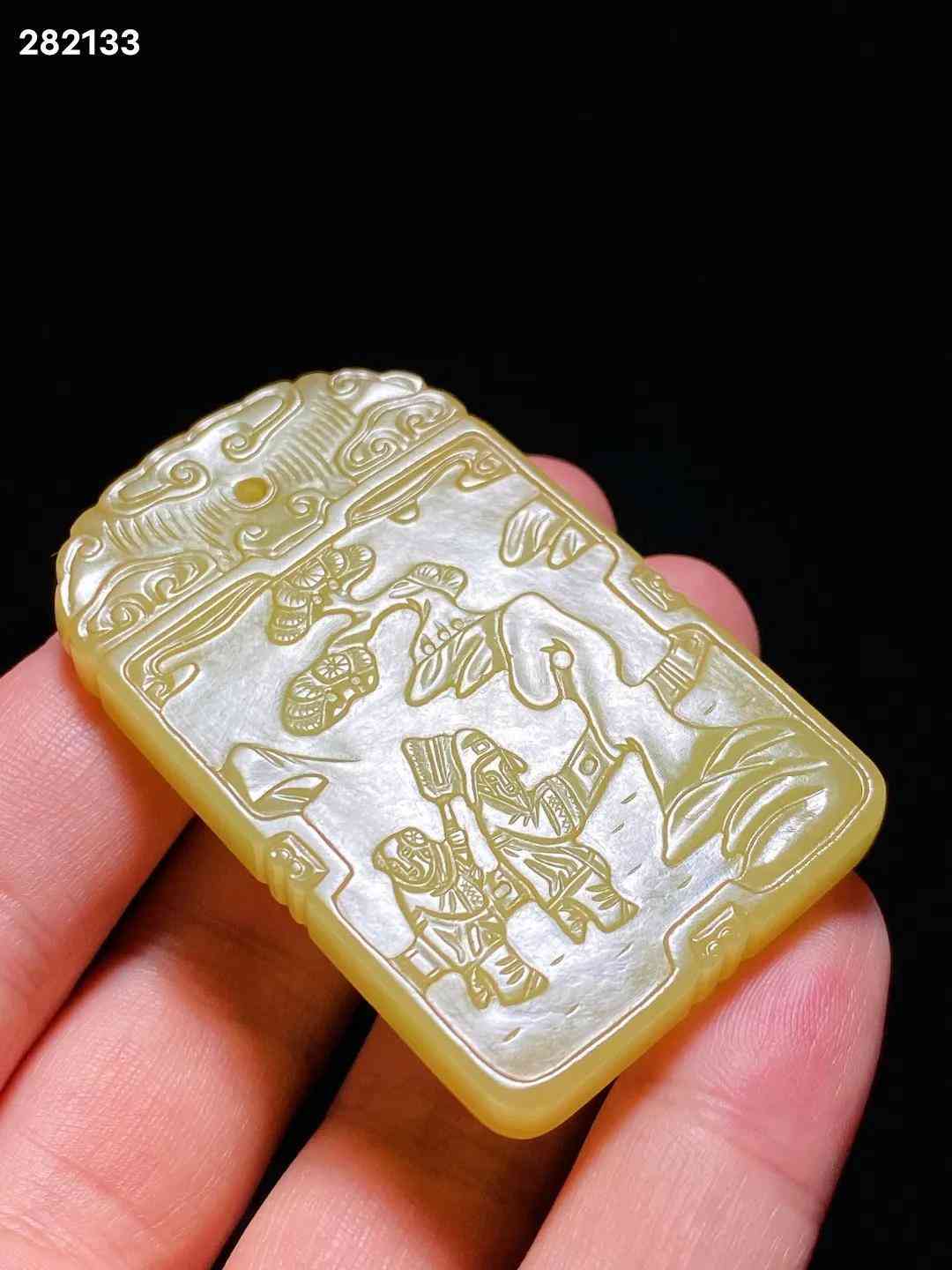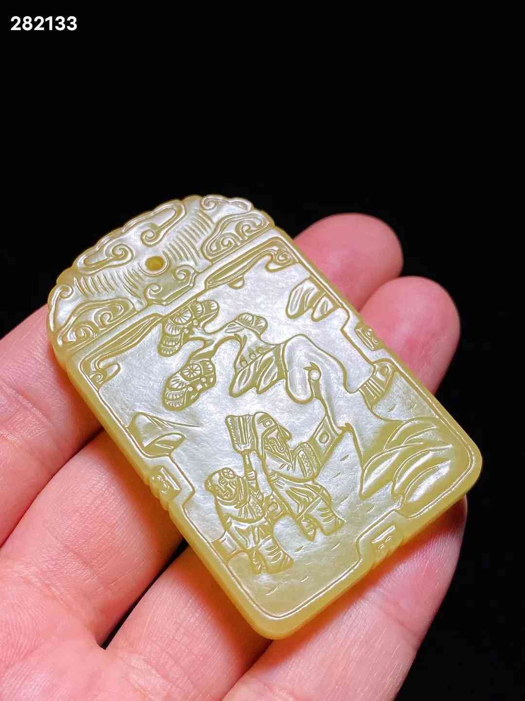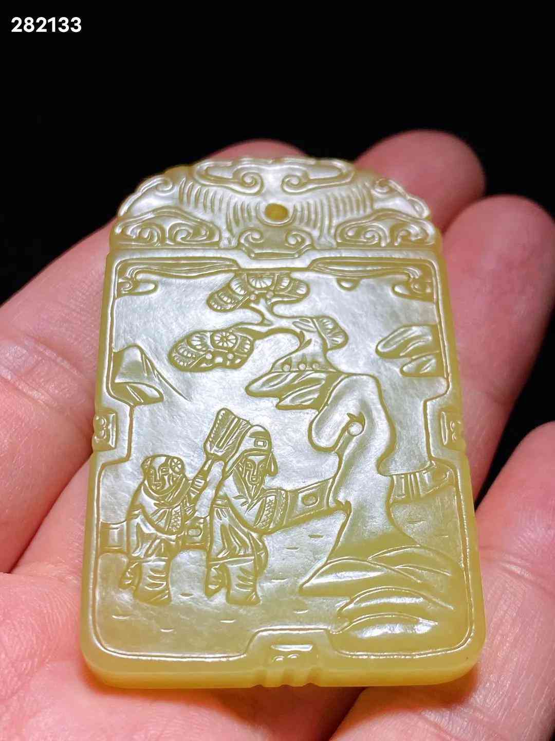 清中期 和田玉籽料 黄玉 米芾拜石 诗文牌 子冈牌 长3.8 宽0.7 高6.1厘米 重42.3克 牌取上好黄玉料琢制而成,色黄且正,柔和如脂。黄玉因其稀有罕见,产量很少,珍贵更甚羊脂白玉。牌首雕如意云纹,剔地阳起雕米芾拜石图,流云满天,古松遒劲,曲水之间,亭栏之内,米芾正躬身稽首,拜伏洞石,侍童执凉扇立于其后。构图舒朗,碾磨俐落,虽为浅浮雕,然沟壑之中过渡精细,更有圆雕逼真之趣,人物衣纹、髯发细入毫微,展现了制玉工匠精湛的艺术功力。玉牌背面开光内刻阳文行书诗句“吾爱孟夫子,风流天下闻。红颜弃轩冕,白首卧松云。”,落“子冈”二字款。米芾是北宋著名书画家,他一生博雅好石,精于鉴赏,对奇石的喜爱简直如痴如癫,毫无顾忌。「米芾拜石」是古代著名的文人典故,始传已久,清代玉雕中常见此题材。
