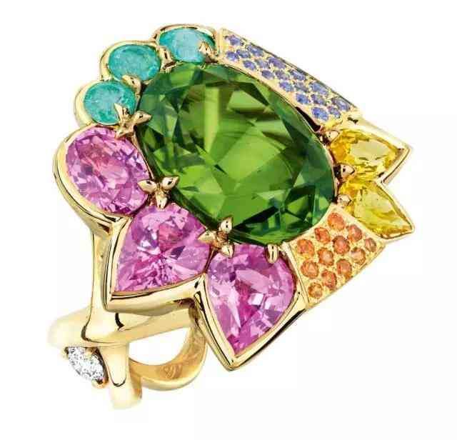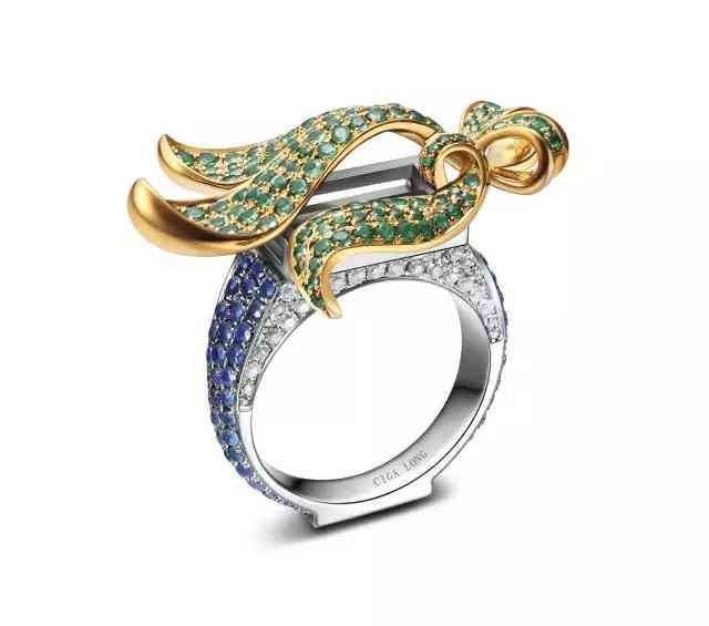 18K金镶嵌翠榴石、蓝宝石、钻石幽兰造型戒指