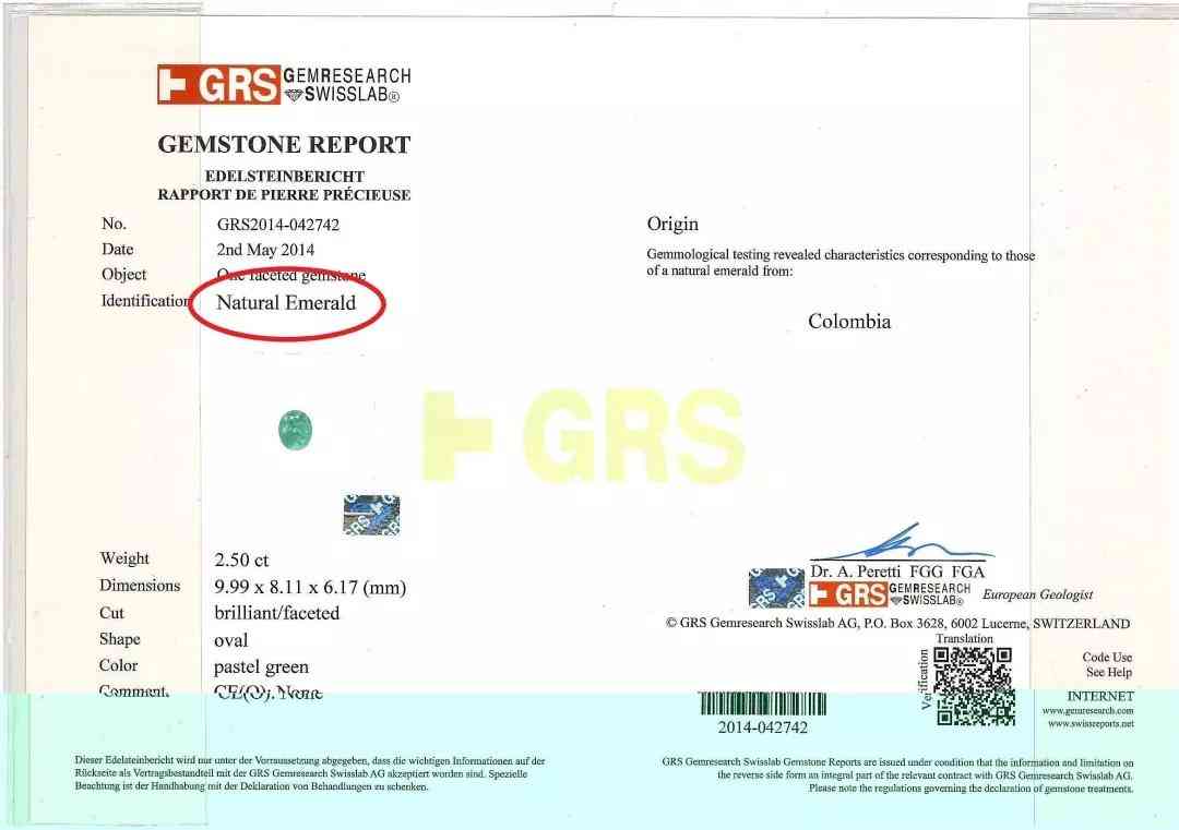 GRS全名为“GEMRESEARCH SWISSLAB AG”,是瑞士籍宝石学博士Dr. A. Peretti创办的宝石鉴定机构。主要为世界主要名贵宝石做检测,如红宝石,蓝宝石,祖母绿和金绿猫眼。