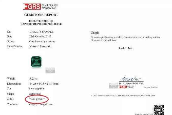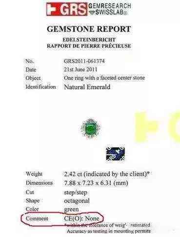 GRS证书上的注释是用来形容宝石是否经过人工处理,或形容人工处理强度的一个参数。对于祖母绿来说,最常见的处理手段就是注油。