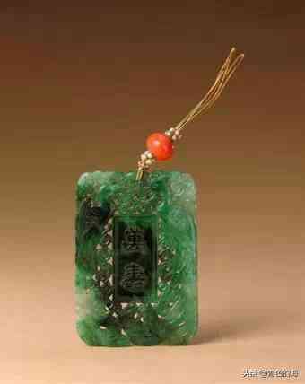 翠镂雕双凤万寿牌,清,长7.3厘米,宽5.1厘米。翠牌长方形,牌体较厚。两面均镂雕双凤相对,凤身下镂雕花卉、朵云纹为地。两面双凤之间分别凸雕“万寿”、“无疆”二字。佩上有系绳,绳上穿有红珊瑚珠。