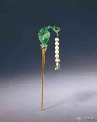 金镶翠挑簪,清,长16.2厘米。此簪金质,簪身细长。较粗的一端嵌接翠簪头,翠质青绿,局部为深绿色。簪头雕作一只手,腕戴白玉镯,五指握一翠如意,如意头勾回,套一翠活环,环下挂珍珠六粒、蓝晶坠角一个。