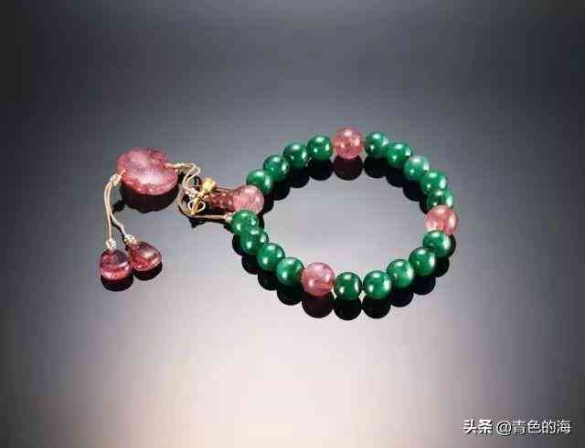 翠十八子手串,清,周长30厘米。清代,翠、珊瑚、粉色碧玺、珍珠都属贵重材料,此作品将其集于一体,在清代宫廷首饰中亦属珍贵。