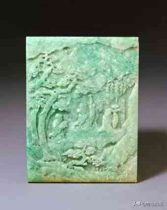翠福禄寿长方插屏心,清,长17.5厘米,宽13.4厘米,厚1.5厘米。翠质青绿色。插屏心为长方形,片状。作品雕山林之景,山石现于作品边部,中间松树成林,松高叶茂,三老人散立于树下。