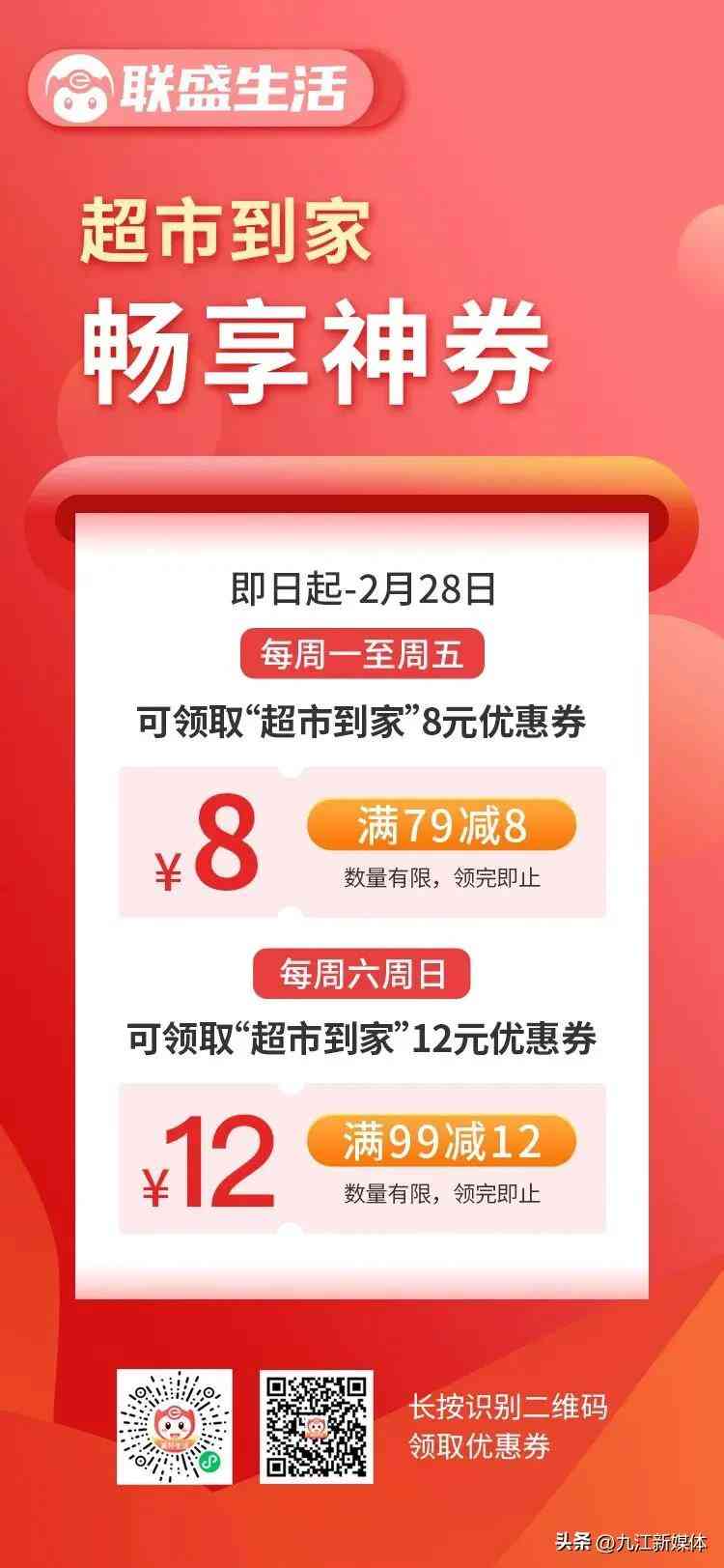 即日起-2023年2月28日,登录联盛生活APP/微信小程序,领“超市到家”8/12元优惠券!