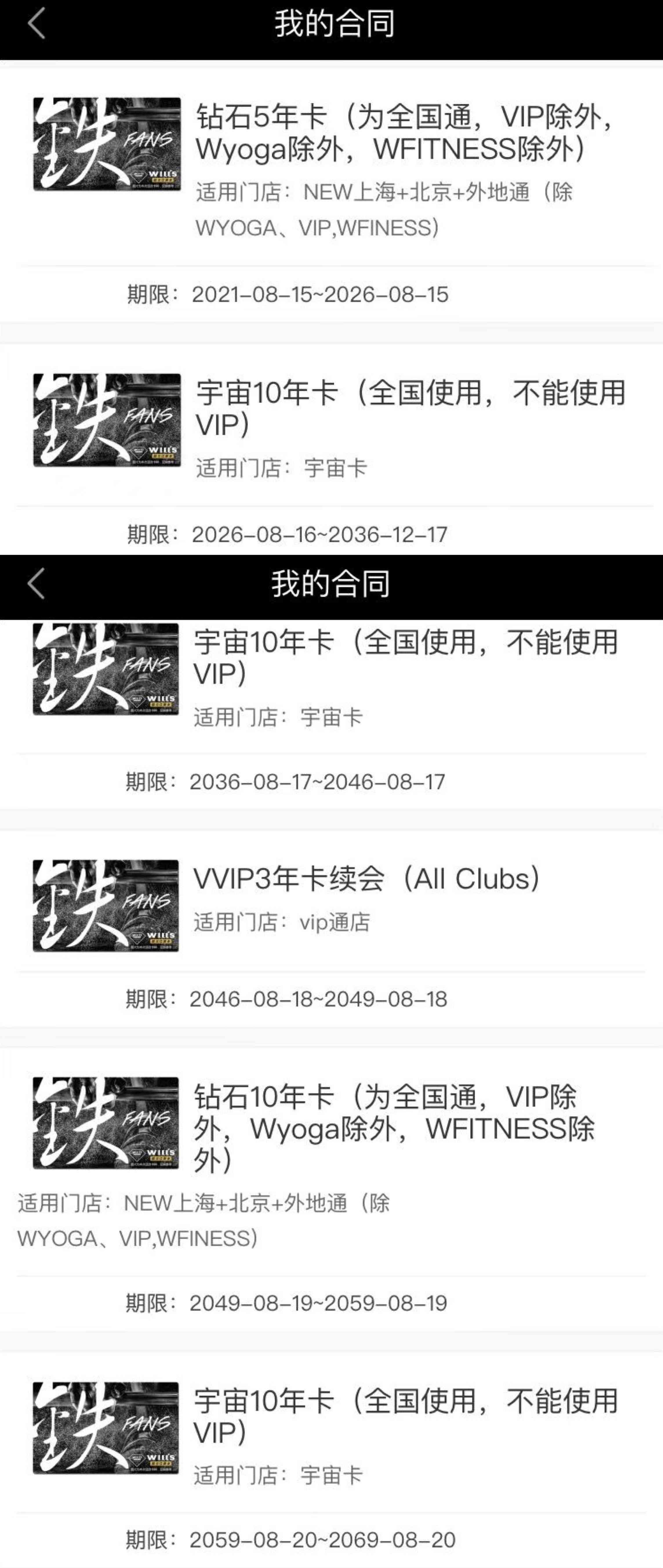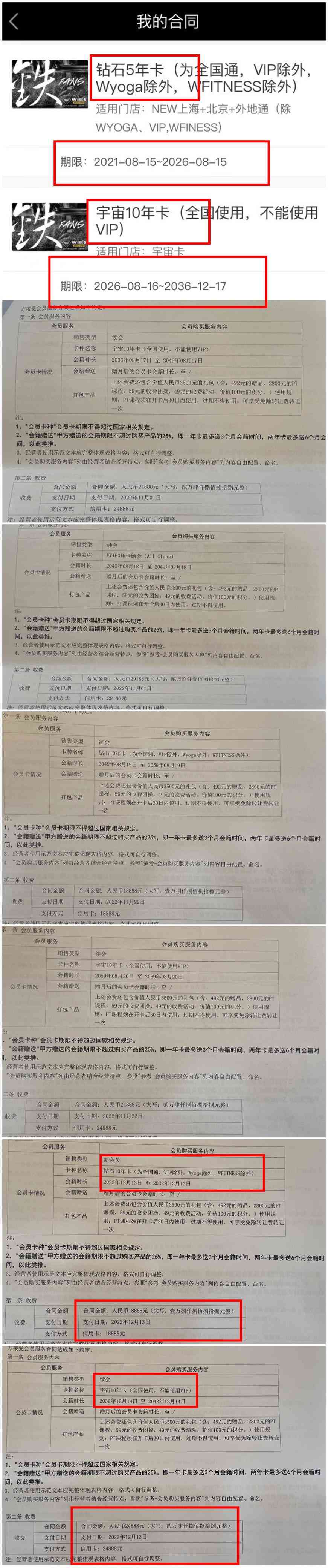我还发觉,在尚海郦景店超年龄办的两张10年卡,两份合同上显示的会籍时长居然是从2022年12月至2042年12月——和我此前购买的会籍卡年限重叠。在威尔仕健身的官方App个人页面,也唯独不显示这两份合同。