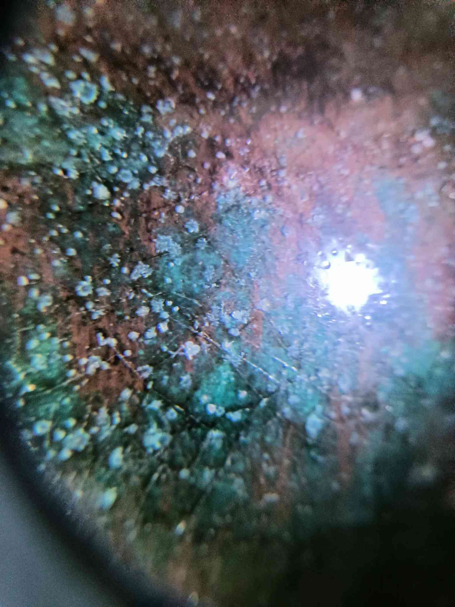 40倍放大镜下,挂霜的造型,似冰似雪花一眼开门,长沙窑产品,这种以铜为釉剂,烧出这般颜色出来,目前,各博物馆没有,苻合真精稀全,但是,谈到新字,本人不敢认同,感觉不出一点新的视觉,所说的高古瓷的新,指的是温润,而不是真正的视觉上的,再发一下全品出来,看看有没有视觉上的新