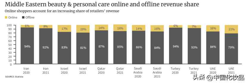 电商的快速发展,对于化妆品等品类尤为利好。原因在于,受当地宗教文化因素印象,女性出门购物往往不便,而线上购物方便了女性在家中消费;同时,过去几年中东的大环境使得女性获得了更多经济权利,再度推动了化妆品、服装等适合于电商的品类发展。