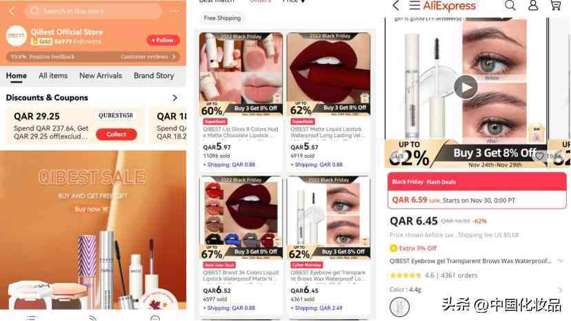 如速卖通卡塔尔地区销量靠前的彩妆品牌QIBEST,门店粉丝数86979人覆盖品类包括睫毛膏、腮红、口红等。在速卖通上,QIBEST一支睫毛膏售价6.45卡塔尔里亚尔,折合人民币仅需要12.6元;一支口红折合人民币11.67元,但销量过万。再以中国出海化妆品牌菲鹿儿为例,其唇膏、粉饼定价也在30人民币以内。
