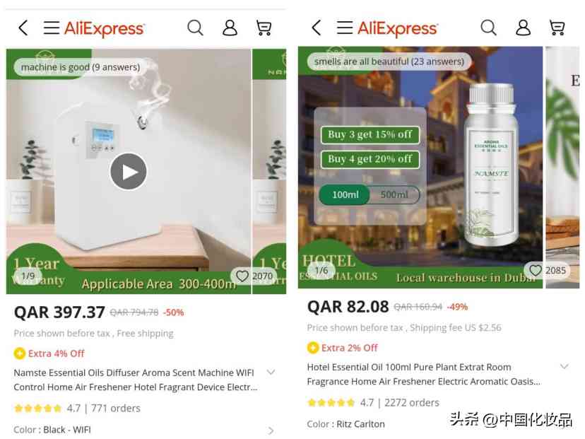 为避开这一市场差异,且获得更高的产品溢价,一些品牌选择从香薰机等家用仪器入手。比如香薰机品牌NAMSTE,在速卖通上一台香薰机售价超770人民币,而配套的一瓶香薰精油,售价则超160人民币。